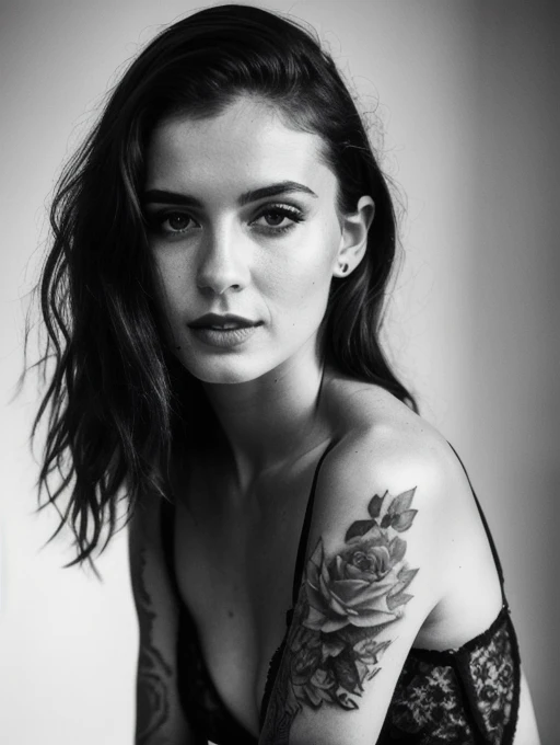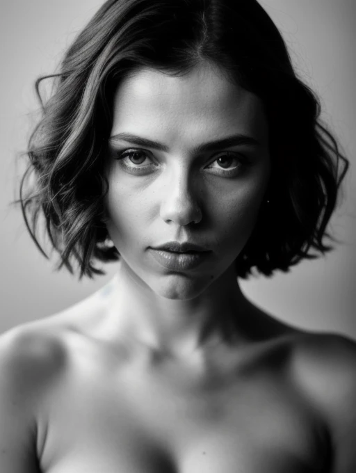 RAW, analog style, An full body editorial photoshoot of a 40 y.o, beautiful woman looking like scarlett johansson. She has big perky boobs, She should have short, messy hair, a captivating gaze, and an alluring expression. The background should be neutral and simple, allowing the woman to be the image\\\'s focal point. Please pay close attention to the details, such as the highlights and shadows on her face and hair, to create a lifelike and realistic image. Experiment with different lighting techniques to enhance the mood and atmosphere of the portrait. The final product should be a masterpiece that captures the essence and beauty of the woman. The image should be in the style of Peter Coulson. ((highly detailed skin, skin details)), sharp focus, volumetric fog, 8k UHD, DSLR, high quality, b&w, film grain, Fujifilm XT3, nudity, nsfw